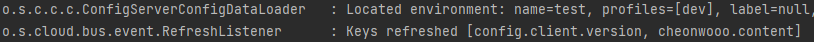 아래와 같이 변경된 설정이 로그에 남는다. 테스트용이라 서비스가 하나밖에 없지만 서비스가 여러개일 경우 config client에 해놓은 설정값 똑같이 해놓는다면 모두 반영될 것이다.
